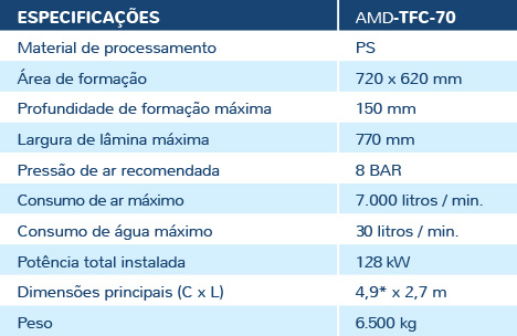 Projetadas para máxima eficiência e produtividade, as Termoformadoras AMD são desenvolvidas utilizando a tecnologia e a experiência de seus profissionais em indústrias de descartáveis plásticos.